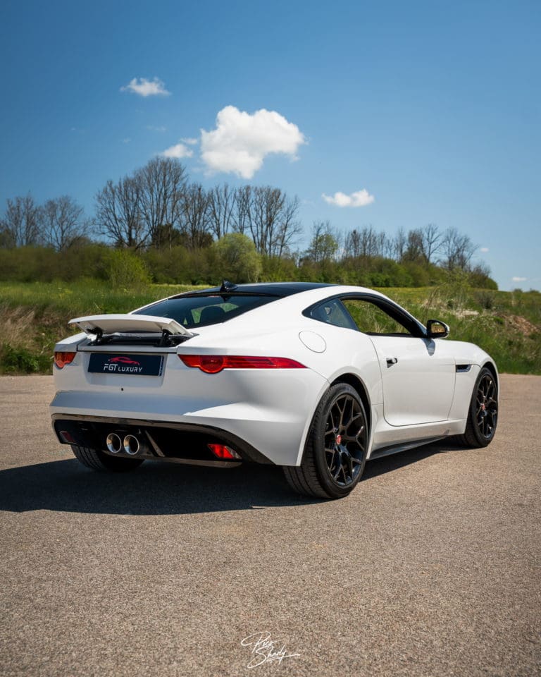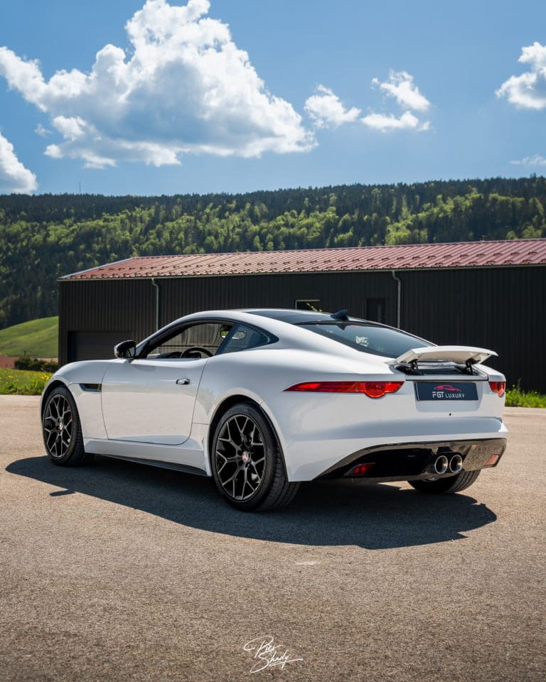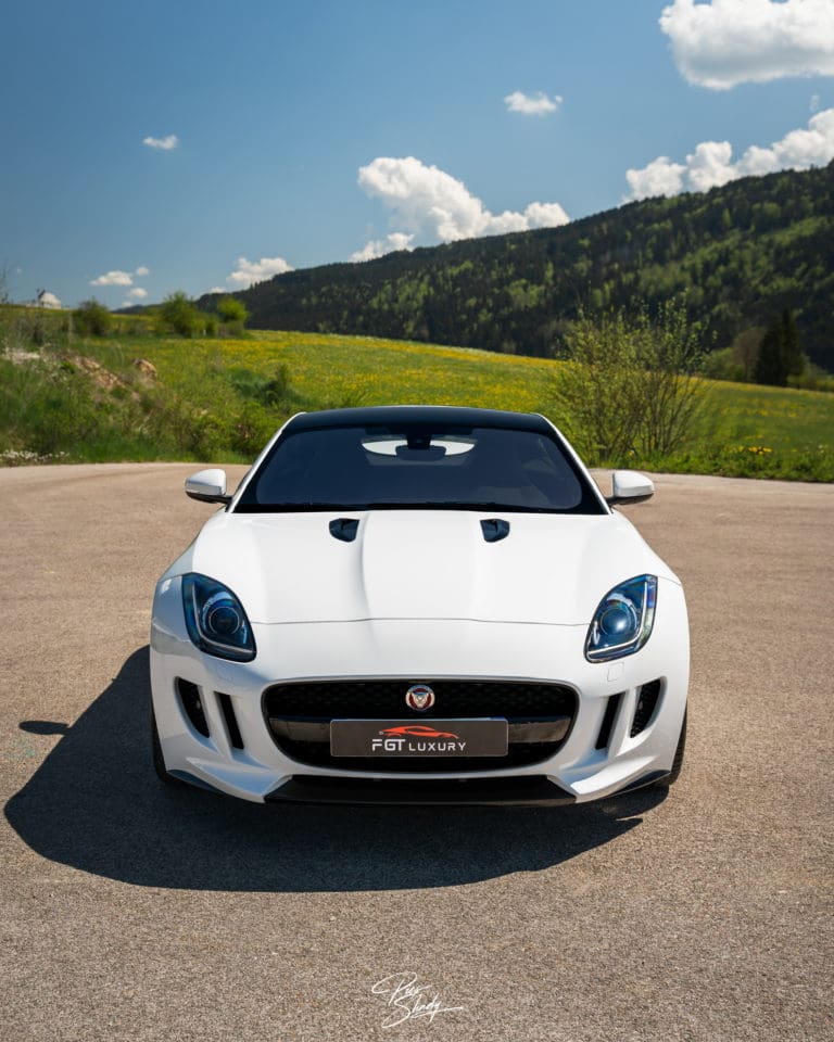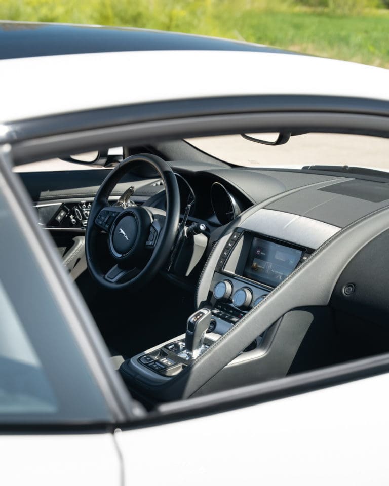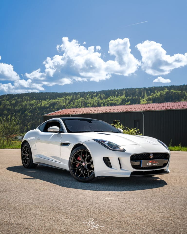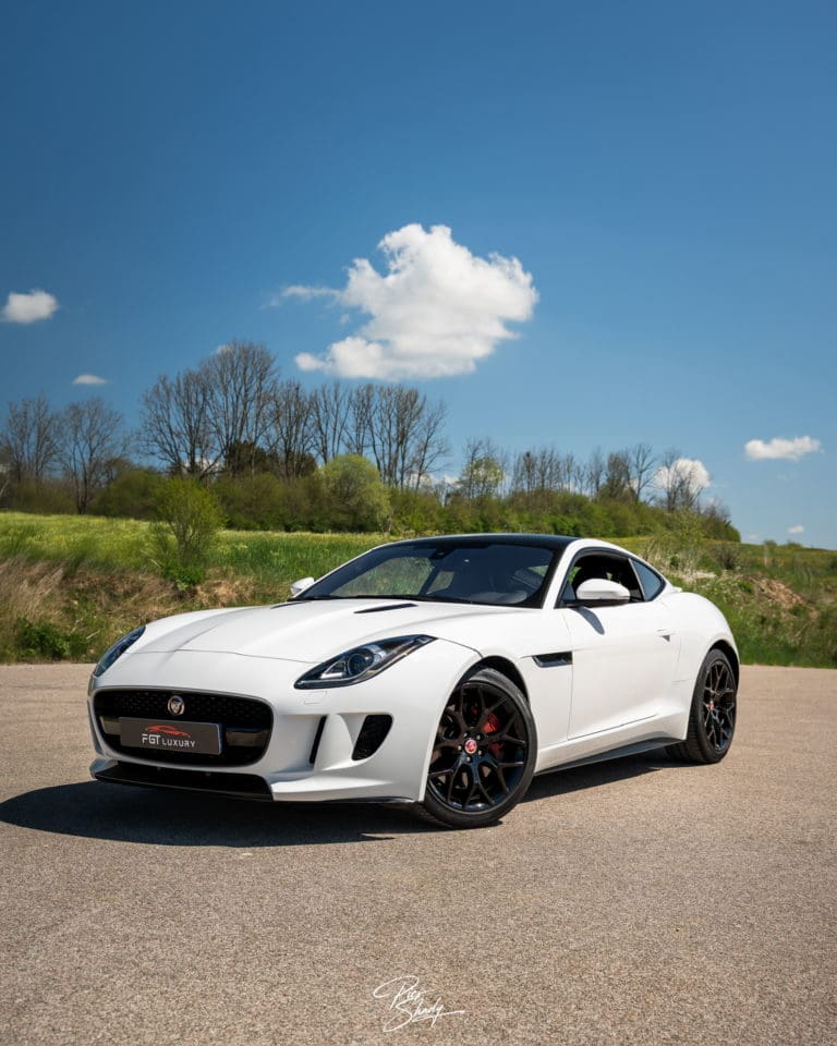 Le véhicule est de couleur Blanc Polaris, teinte classique emblématique de Jaguar.